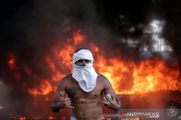 An opposition demonstrator with wounds gestures in front of a burning bus, while holding a rock, near the Generalisimo Francisco de Miranda Airbase “La Carlota” in Caracas, Venezuela April 30, 2019. REUTERS/Ueslei …Sumber: https://www.antaranews.com/foto/851496/bentrok-di-venezuela